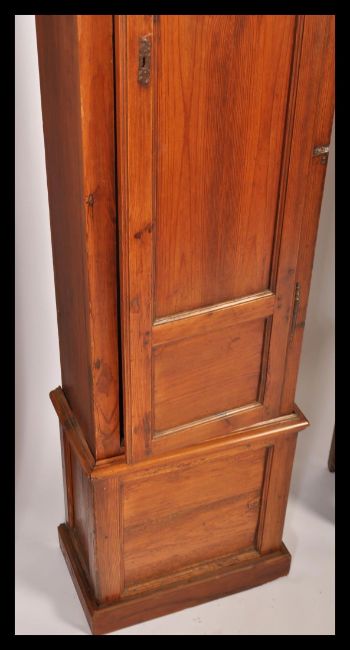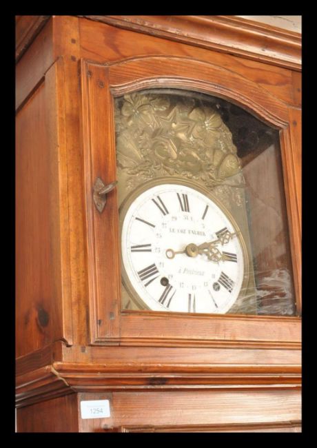 A 19th century French fruitwood longcase / comptoise grandfather clock. The white enamel dial signed for Le COz Falher Pontrieux  having stunning stamped brass star spandrels and the arch embossed with a decorative scenes and further central star. Set within a fruitwood case having glass pendulum window. With weights and pendulum