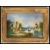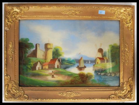 A Victorian oil on glass reverse painting. The colourful painted glass panel with scene of river, boat, castle and windmill being set in a good gilt frame