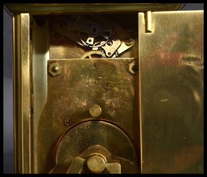 An early 20th century brass carriage clock with inset French movement marked for Duverdrey  & Bloquel - 9 jewels unadjusted. Enamel face with roman numeral chapter ring and faceted hands. Handle over open window escapement. The dial marked for Bayard 8 Day. Measures 12 cm high.