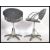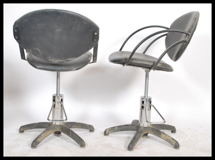 A pair of retro style barbers stools, black leatherette upholstery raised on an adjustable chromed base. Measures: 94cm high x 56cm wide x 60cm deep.