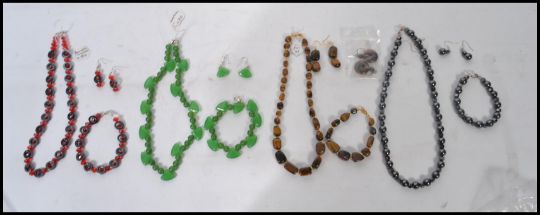 A collection of four good gemstone and other bead necklace, bracelets and earring sets. To include hematite, crystal, and tigers eye. Measures