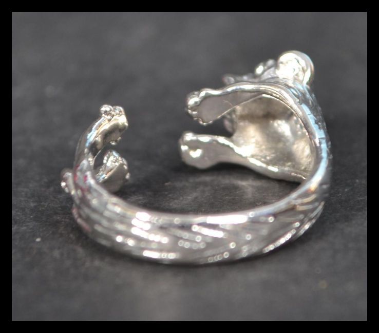 A sterling silver novelty ring in the form of a bulldog complete in jewellery presentation box. Size q but adjustable.