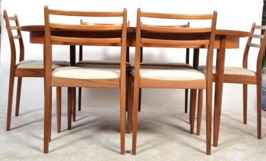 A 1970's G-Plan Sienna range teak wood extending dining table and chairs suite. The table being raised on turned legs with extending centre. Together with matching chairs. Measures: 80cm high x 205cm wide x 46cm deep.