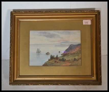 A 19th century Victorian Cornish / Devon school watercolour painting depicting a sailing ship at full sail by coastline with hills to the distance signed S Mills ? 1871. Measures 17cms by 25cms.