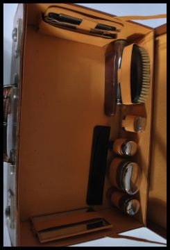 A fantastic gents vanity travelling suitcase / case fully appointed having various white metal topped glass bottles and phials with toothbrush , brush , lift out shaving kit etc. Please see images.
