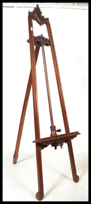 A good 20th century mahogany artists easel of tall folding form having threaded adjustable rest to centre with carved rococo detailing elsewhere