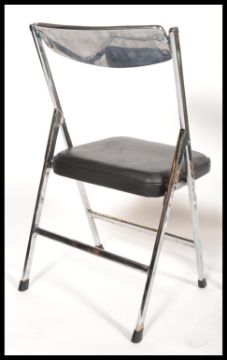 Camel Steel - A pair of mid Century vintage industrial Japenese folding chairs constructed from a tubular chromed metal having black leather sprung seat pads and revolving backrest with pad, once folded out it creates a sleek angular shape. applied plaque to the seat underside. Measures: 80cm high x 44 cm wide x 38 cm deep.