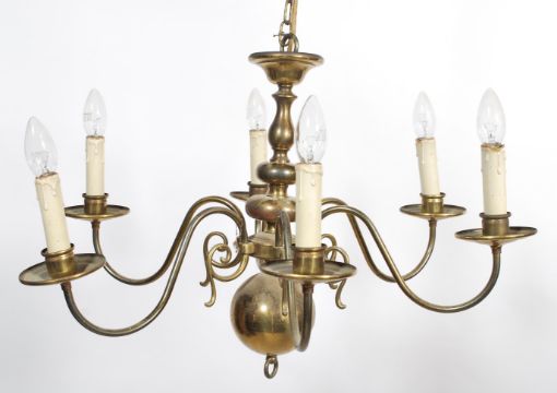 A 19th century style brass six branch ceiling chandelier, with foliate sconce arms and ball finial centre