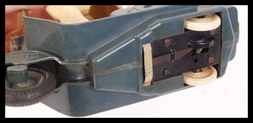 A rare vintage Mettoy made Moped Motorcycle and rider plastic friction powered toy. Complete with rider. Measures approx; 15cm tall, rare.
