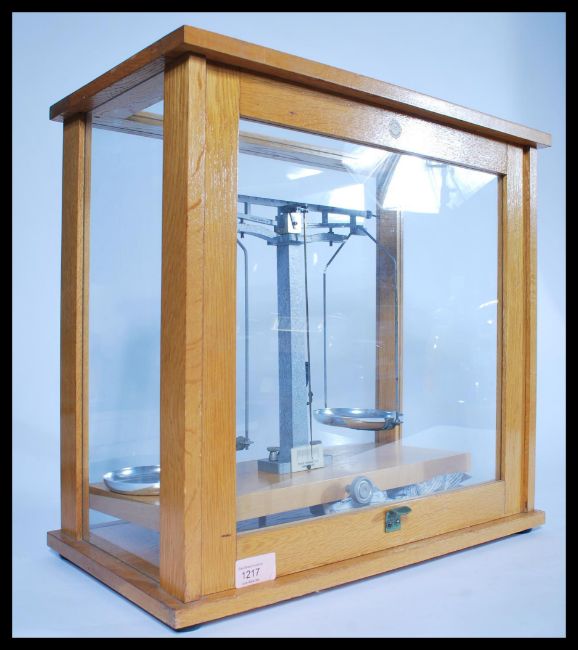 A set of vintage apothecary scales and weights, housed within a wooden and glass case, sliding front panel with makers applied plaque for Phillip Harris Birmingham. Measures 43 cm high, 46 cm wide and 25 cm deep.