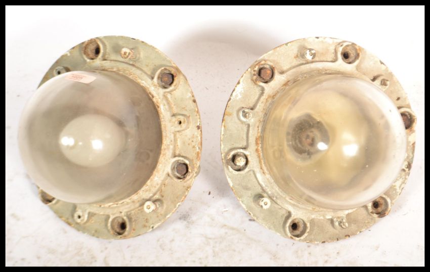 A pair of vintage retro 20th century space age style GEC industrial caged bulk head lights.