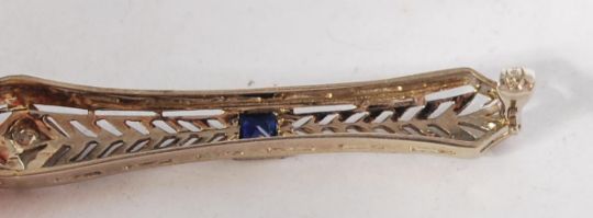 An 18ct white gold art deco bar brooch set with sapphires and diamonds. Weighs 4 grams.