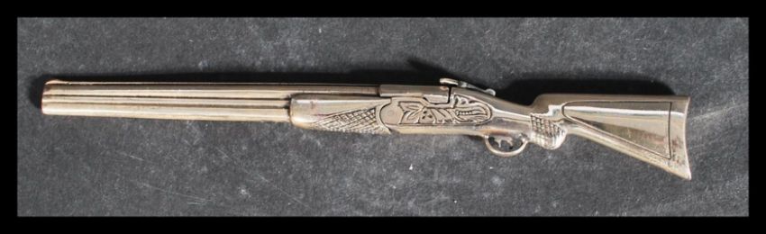 An Italian sterling silver 925 long barrelled dual shotgun with opening loading mechanism. Bearing Italian Hallmarks. Weighs 57 grams. Measures 16 cm long.