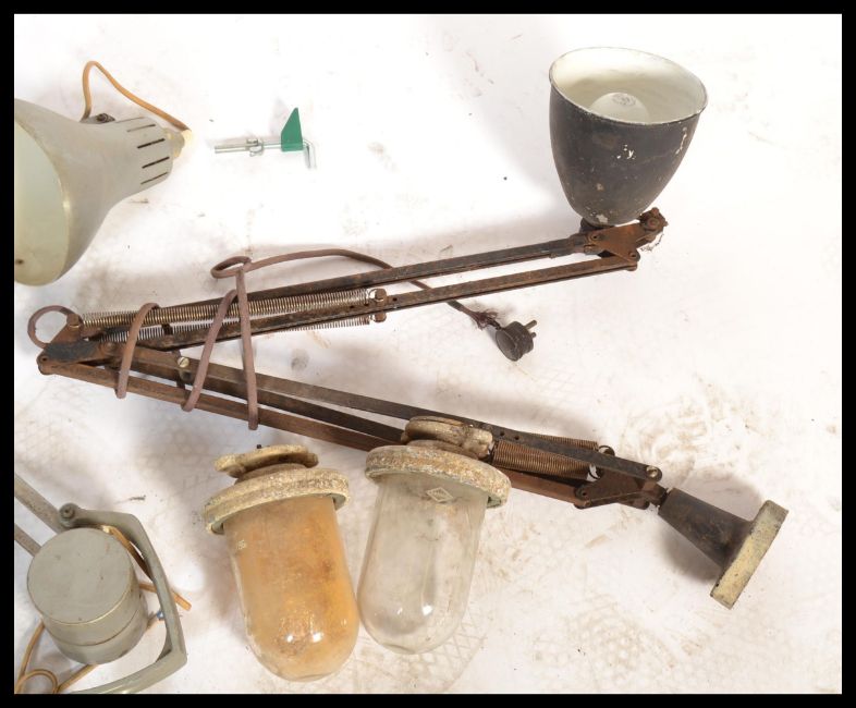 Three vintage retro 20th Century engineers / machinist lamps to include a Hardily Horstman  counter balance angle poise clamp lamp, a Herbert Terry and another. Measures: 110cm high.