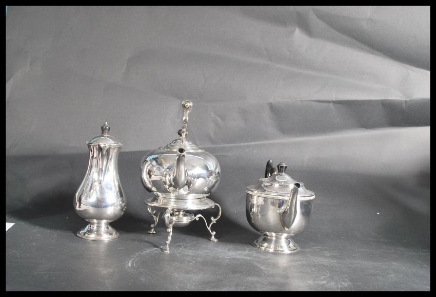 A silver plate picnic kettle spirit burner on scrolled tripod base , a water jug with scrolled handle by James Deakin and a Garrard Regent plate teapot with shaped handle.