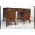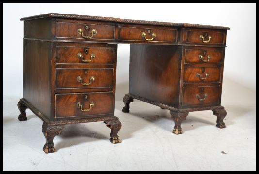 A good circa 1900's Edwardian inverted breakfront desk having a bank of drawers to each pedestal with brass swing handles, the top with tooled leather writing skiver