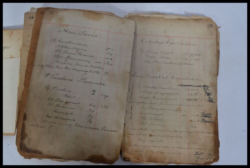 Two antique c1910 Edwardian recipe books. The first dated 1911 written by an ' HR Thurgar ' (?) which includes recipes for such things as ' Furniture Cream,' 'Worm Powder For Dogs,' 'Digestion Mixture,' and various others (part filled). Along with an earlier but much heavier worn recipe book - which contains various similar recipes. Interesting items. Harry Thurgar was an apprentice chemist from Braintree.