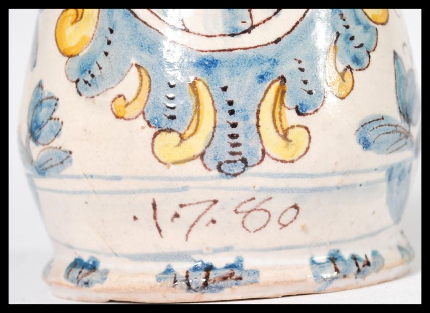 A believed 18th century French / Italian faience majolica polychrome vase dated 1780 with central cartouche panel depicting a crucifix with leaves. Blue and white hand painted decoration with gold crown and scrolls. Measures 20 cm high.