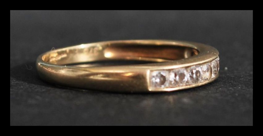 A hallmarked 9ct gold 8 stone ring set with 8 channel set white stones. Hallmarked Birmingham. Weight 1.7g. Size O.5.