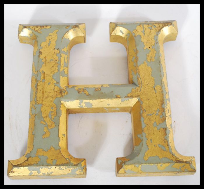 A set of vintage early 20th century food labels on ivorine plaques with sticks reading Selected Guaranteed , Sound Choice Eating , Cash Is Wanted Low Prices etc. Along with a large gilt finished letter H.