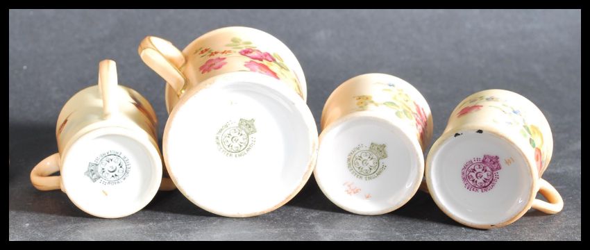A group of eight Royal Worcester ivory blush miniature tankards and cups. All hand painted with flowers. Two three handled loving cups , one two handled cup and five graduating tankards. Please see images. Highest measures 6 cm.