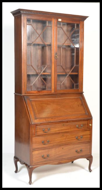 An early 20th century mahogany bureau library bookcase being raised on cabriole legs with a bank of drawers having appointed interior with astragal glazed bookcase cabinet above. Flared cornice atop.
