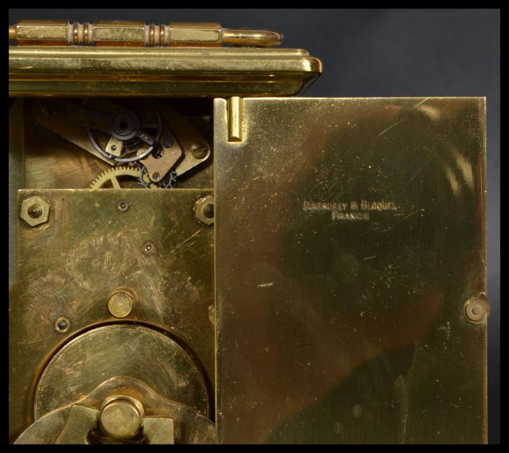An early 20th century brass carriage clock with inset French movement marked for Duverdrey  & Bloquel - 9 jewels unadjusted. Enamel face with roman numeral chapter ring and faceted hands. Handle over open window escapement. The dial marked for Bayard 8 Day. Measures 12 cm high.