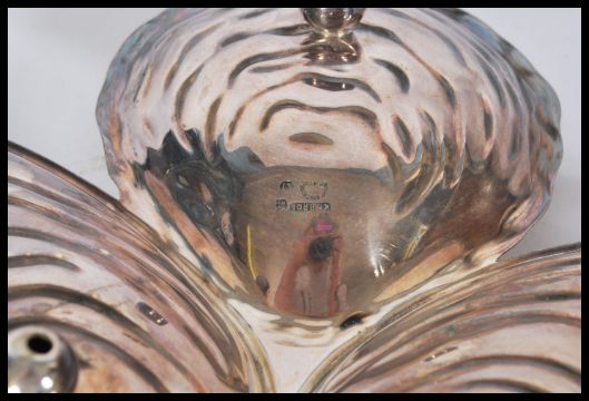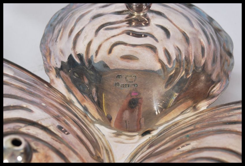 An early 20th century silver plated trefoil dish in the manner of WMF of oyster shell nautical form along with two cased sets of retro wooden handled flatware cutlery.