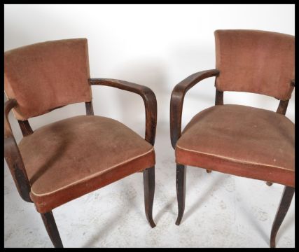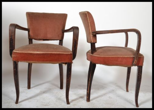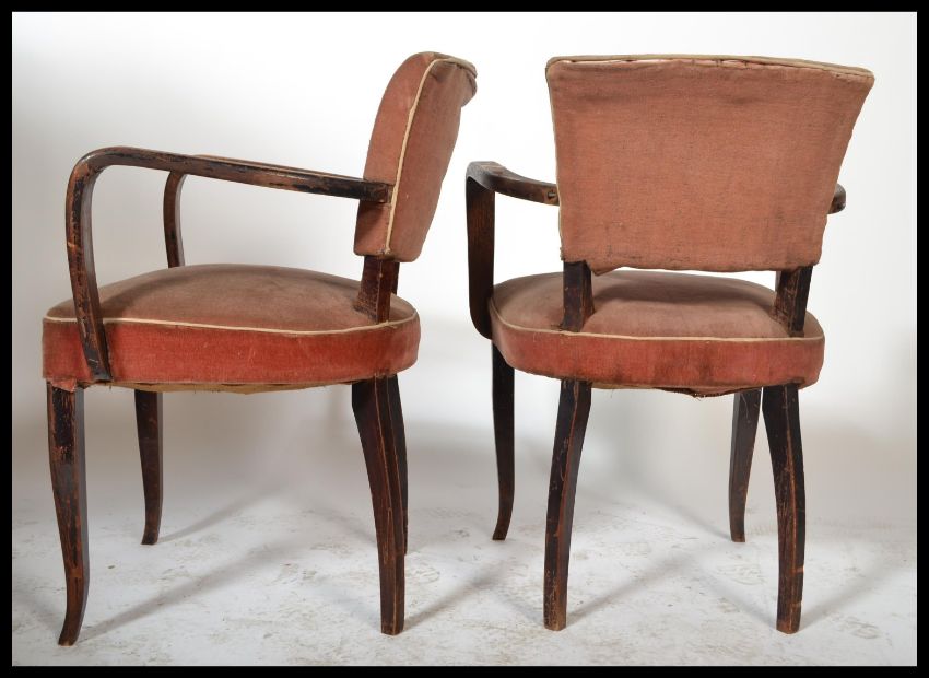 A pair of original 1930's French Art Deco bridge chairs / armchairs. Raised on saber tapered supports with bentwood elbow rests with vinyl pad seats and back rests