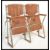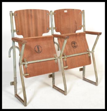 A vintage 20th centurty industrial pair of cinema chairs on tubular metal frame' wooden back rest and flip down seat. Measures: 88cm high x 97cm wide x 44cm deep.