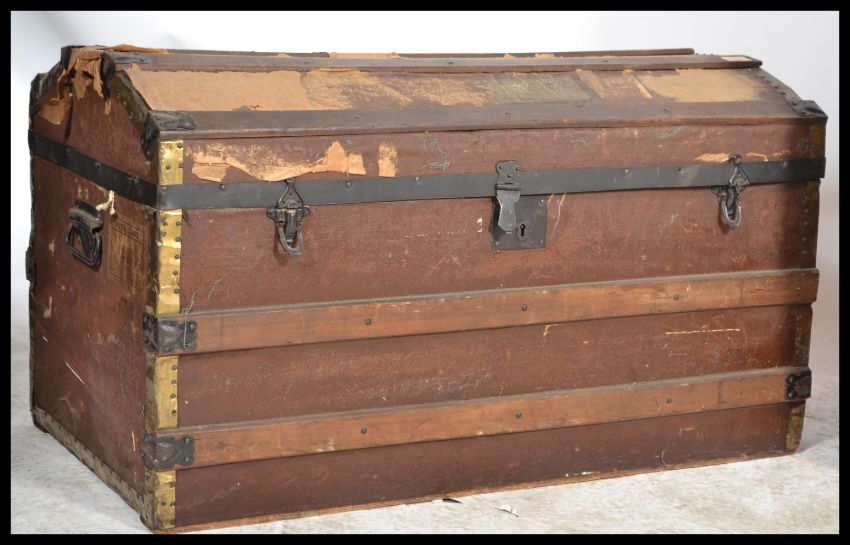A collection of vintage 20th Century suitcases to include leather examples together with a vintage dome top steamer trunk.