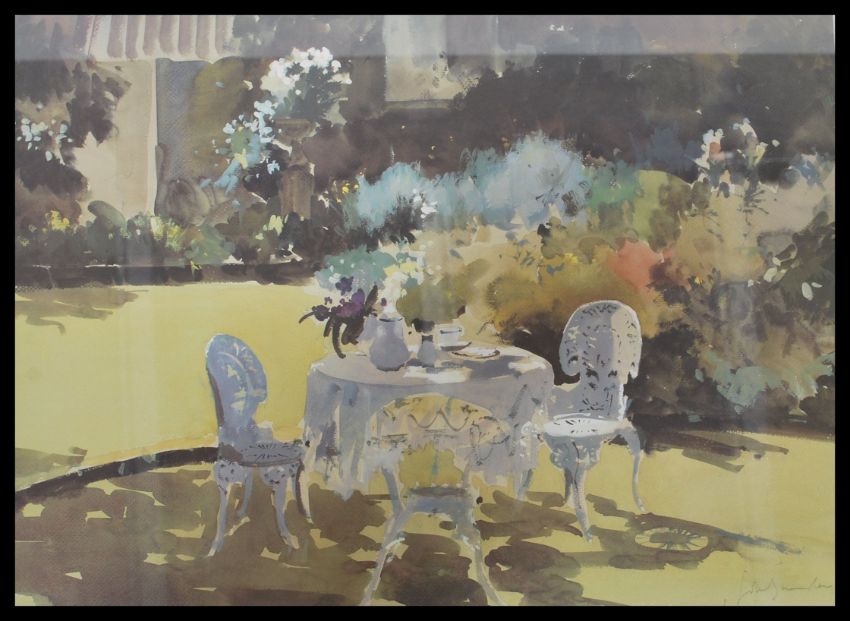 A framed and glazed print of a garden scene being signed in pencil by the artist to the margins having blind stamp for the Alexander Gallery, Bristol. Together with another garden scene. Measures 72cms x 62cms