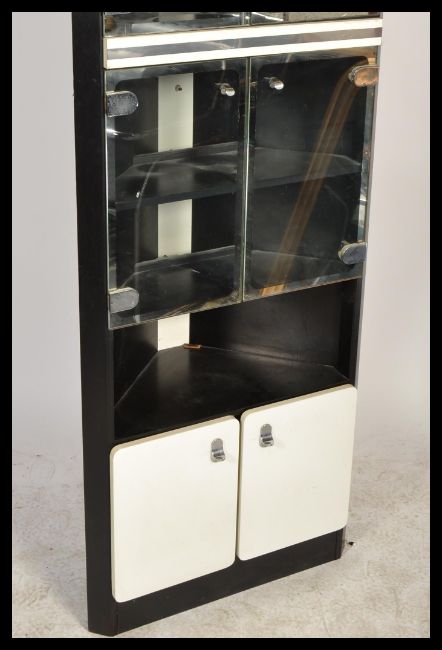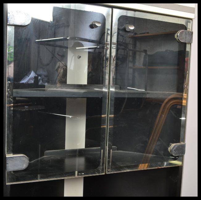 A retro 20th Century corner unit display cabinet, smoked glass doors with fitted white panel doors. Measures: 180cm high x 65cm wide x 95cm deep.
