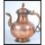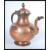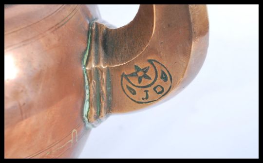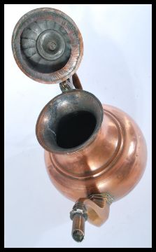 A middle eastern metal-ware brass and copper coffee pot, probably Turkish, tapering circular form, scroll handle, domed hinged cover.Star and moon mark to the spout. Measures 29 cm high.