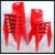 A set of ten retro style stacking chairs in the manner of Kartell, each chair moulded in a single piece of robust plastic in a red colourway. Measures: 81cm high x 46cm wide x 52cm deep.