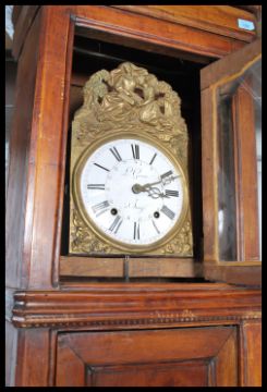A 19th century French longcase / comptoise grandfather clock. The white enamel dial signed fpor L Goron a' A Sanze having stunning stamped brass spandrels and the arch embossed with a decorative scenes. Set within a fruitwood case having glass pendulum window