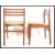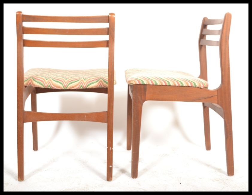 A set of 4 mid century Danish influence teak wood dining chairs. Raised on squared legs with pad seats and railed back rests