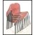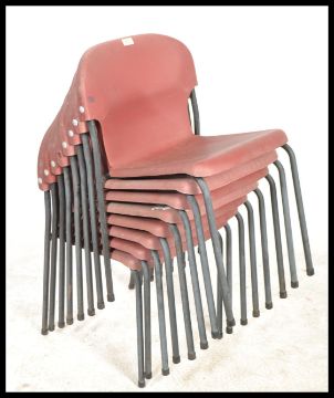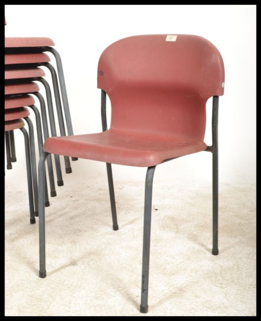 A set of 8 mid century / 1970's stacking chairs with composite red seats set over grey tubular metal frame supports