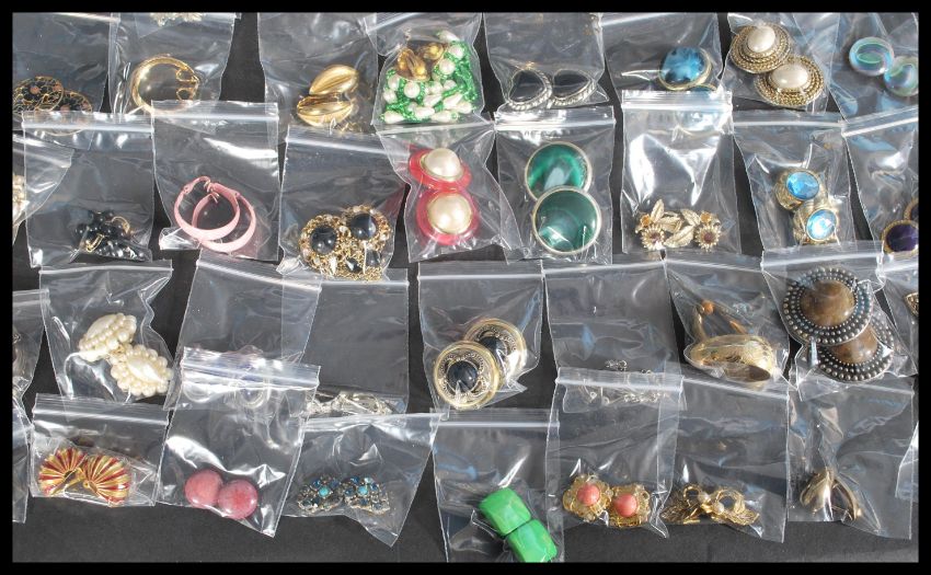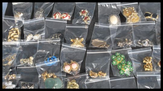 A large collection of vintage costume jewellery to include many pairs of vintage dress clips , necklaces , brooches etc. Rhinestone and enamel examples among others. Please see images.