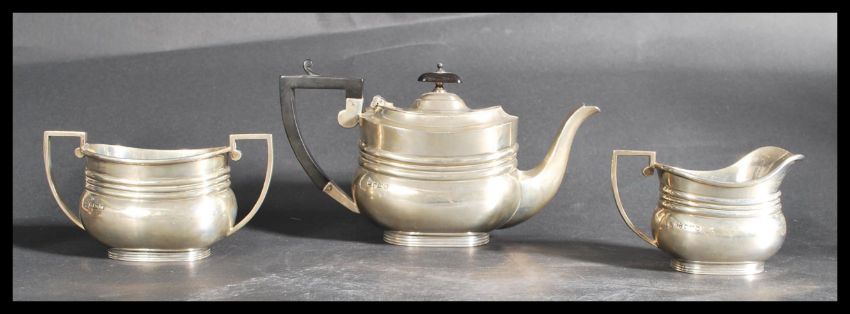 A silver hallmarked three piece tea service by Fordham & Faulkner (William Charles Fordham & Albert Buckley Faulkner) bearing Sheffield Assay marks dating to 1914. Consists of teapot sugarbowl and creamer jug. Total weight 705.5 grams gross.