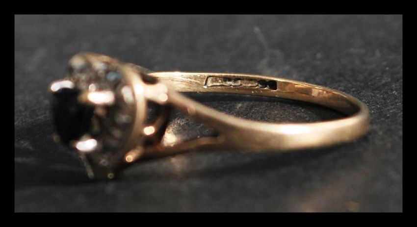 A hallmarked 9ct gold sapphire and diamond ring in the form of  heart. Weight 1.5g. Size M.5.