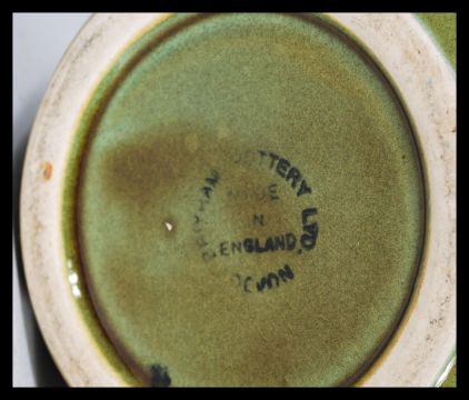 A group of vintage studio pottery to include a Troika Wheel vase , a Carn Penzance pottery baluster vase and a green pottery vase by a Devon potter. Highest measures 17 cm.