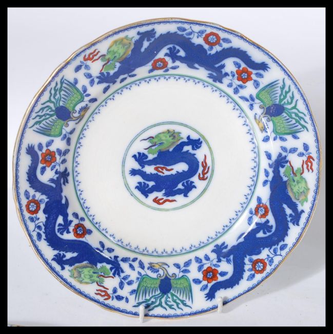 A group of early 20th century Royal Worcester cabinet plates in the fide et fiducia pattern with gilt details and central medallion along with a pair of Chinese Dragon and Bird by Mintons / Minton with Victorian date lozenge and a hand painted Japanese Imari plate (AF). Largest measures 23 cm diameter.