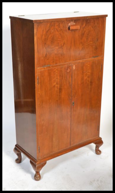 A 1930's Art Deco walnut cocktail cabinet being raised on stub cabriole legs with cupboards under an articulated hinged top with fall front and lift top opening to reveal appointed interior within