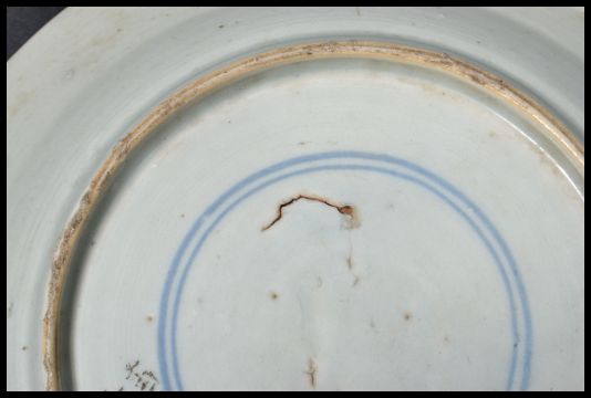 A pair of 18th century Chinese blue and white hand painted plates having blue borders with central panels depicting still life basket with flowers. Measures 20 cm diameter.