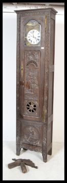 A 19th century French chestnut / oak large Breton compoise longcase clock having  oversized trunk and hook with decorative glass window and brass pendulum. Above an enamel face with   pressed gilt metal spandrels having flower basket design. Complete with weights