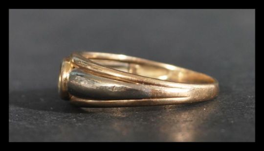 A hallmarked 9ct white and yellow gold ring with an oval cut bezel set emerald. Import mark for Birmingham. Weight 3g. Size R.