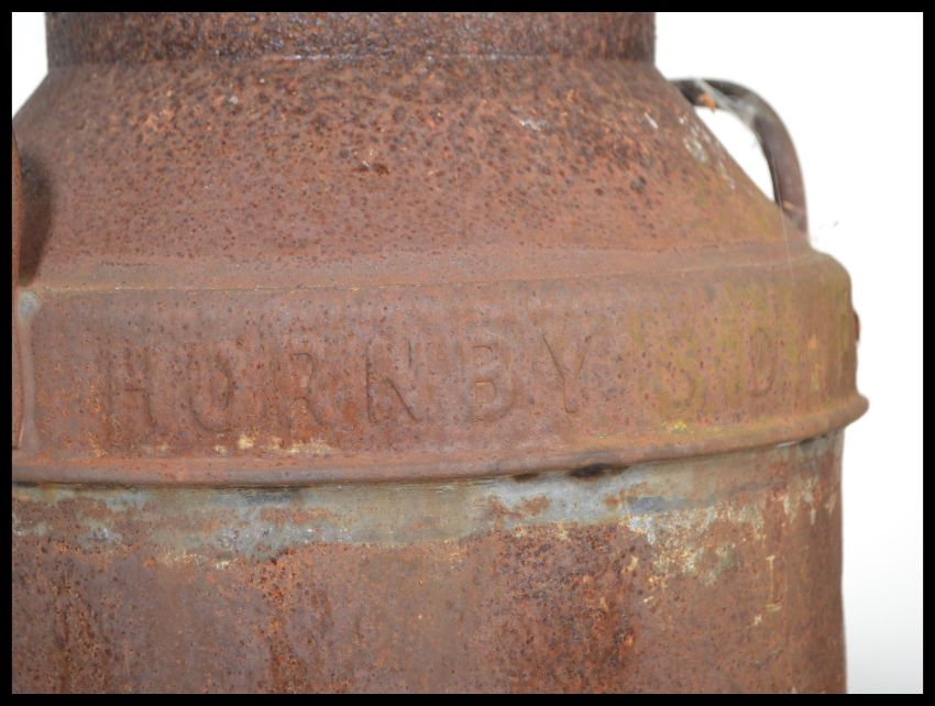 A vintage Industrial dairy milk churn of cylindrical construction with Hornsby Daires  makers name complete with lid and twin handles