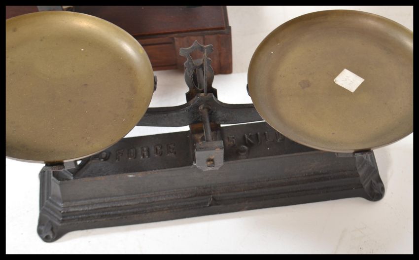 A set of three vintage early 20th Century pan scales, set to heavy cast bases.