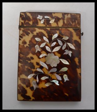 A 19th century Victorian tortoiseshell card case of rectangular form, side hinged button release lid, blonde shell to spine, with mother of pearl floral inlay. Measures 10 cm high.